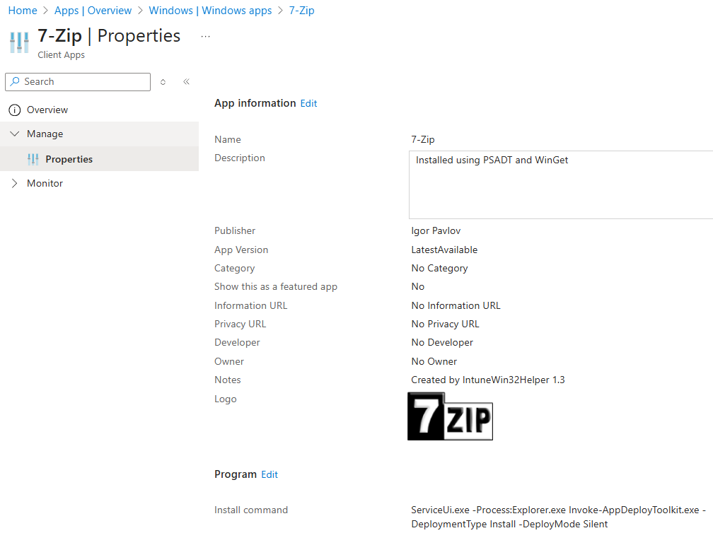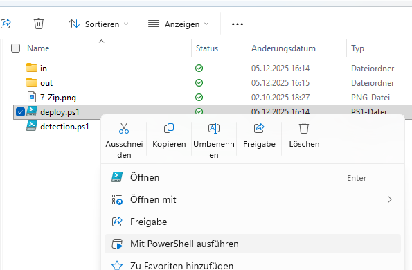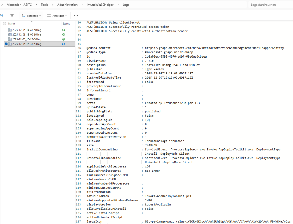 Es passiert noch einiges mehr, aber das soll für den Moment reichen. Wichtig ist: Am Ende haben wir im PackageRoot ein komplett fertiges Verzeichnis liegen, das alle Daten enthält, um 7-Zip standardisiert zu deployen – inkl. eines Skripts (deploy.ps1), um das Deployment nach Intune zu starten. Da wir „Create and deploy“ gewählt haben, startet das Tool dieses Skript nun ganz automatisch 🙂 Später kann man es bei Bedarf aber auch erneut einfach manuell starten.