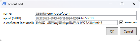 Im Tool auf das Zahnrad unten links, dann einen neuen Tenant anlegen und die Daten von oben hier hineinkopieren. Übrigens ist die „anzeigen“-Box derzeit nur Zierde, in der Übersicht ist das Secret dann doch wieder einfach so sichtbar :). Und entgegen der Beschreibung ist das ClientSecret nicht optional, sondern essentiell. Speichern nicht vergessen!