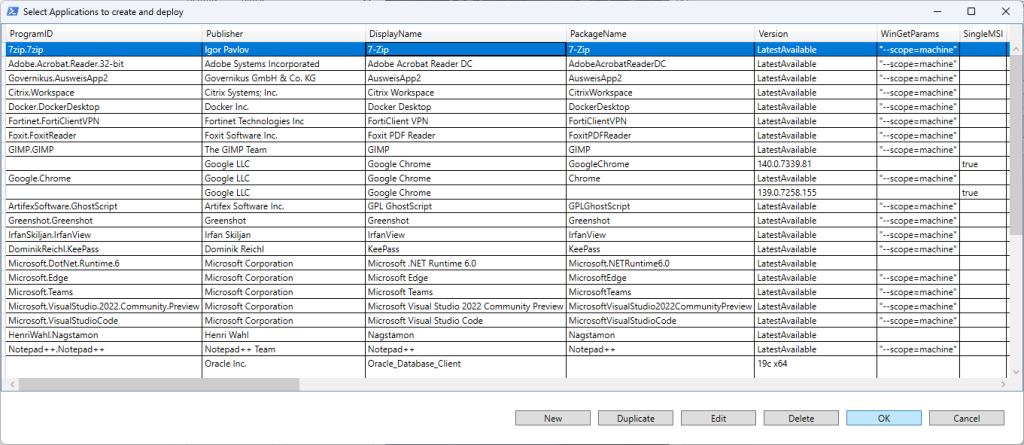 Nun kann es losgehen. Am einfachsten nehmt ihr eine App, die ich schon im CSV hinterlegt habe. Fangen wir mit 7-Zip an, in unserem Fall ein Beispiel für ein WinGet-basiertes Deployment. Das schöne hieran ist: Ihr müsst nichts herunterladen und in das Quellverzeichnis kopieren, alles wird von den Clients zum Installationszeitpunkt dynamisch aus dem Community Repo heruntergeladen. Daher ist der Ablauf hier denkbar simpel.
